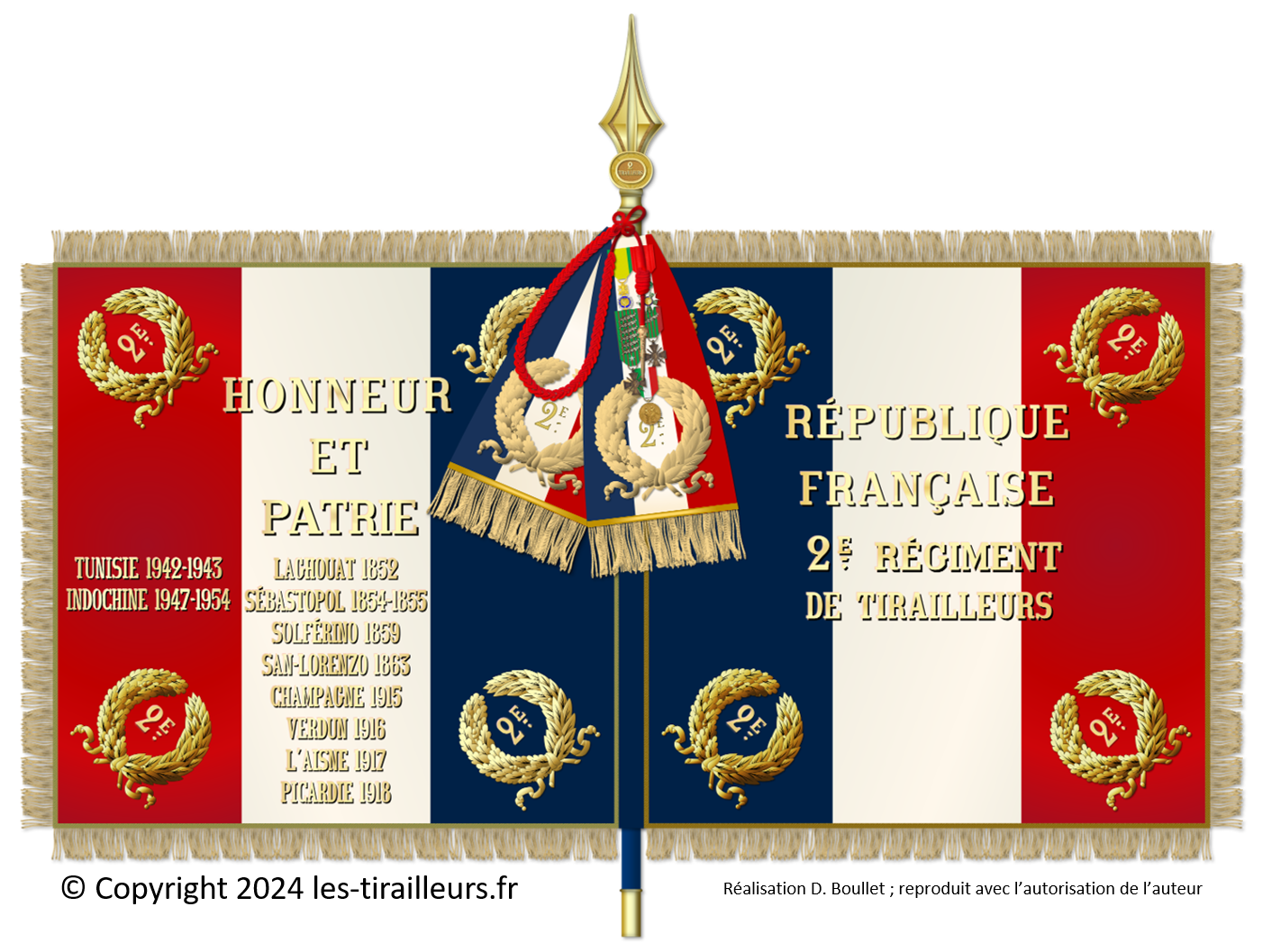 LAGHOUAT 1852 ; SEBASTOPOL 1854-1855 ; SOLFERINO 1859 ; SAN-LORENZO 1863 ; CHAMPAGNE 1915 ; VERDUN 1916 ; L’AISNE 1917 ; PICARDIE 1918 ; TUNISIE 1942-1943 ; INDOCHINE 1947-1954 ; AFN 1952-1962